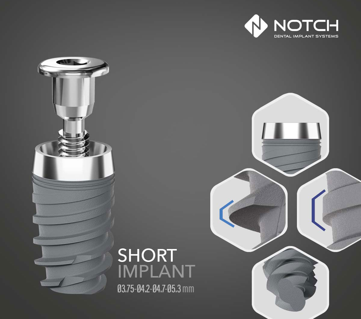 SHORT Implant features an aggressive thread profile and a tapered body and designed particularly for the cases where inadequate bone is present. 6 mm rough surface length allows clinicians to avoid vital structures with confidence therefore eliminates the need for grafting procedures that are complicated and slow to heal. 1.4 mm transgingival part makes it easier-to-use in posterior region.
