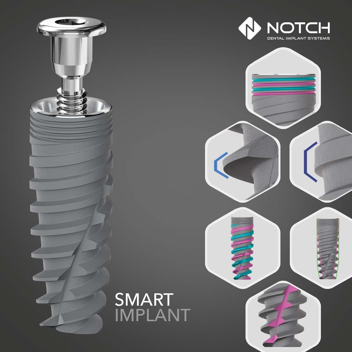 Smart Implant SMART Implant is the optimal solution for immediate implantation and immediate loading. Implant body and thread design condense bone during insertion, providing high primary stability particularly in compromised bone. The apex and body structure is fully compatible with the step burs in the surgical kit.
